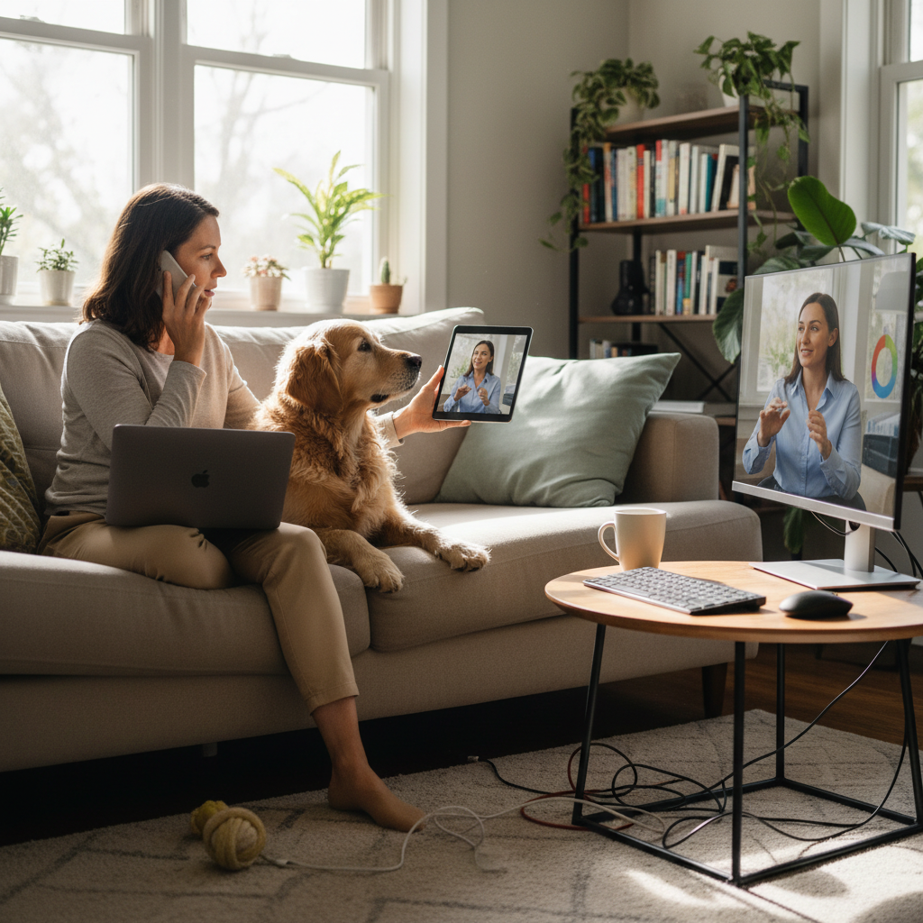 Ilustracja: Konsultacja online z behawiorystą pozwala obserwować zwierzę w naturalnym środowisku domowym.