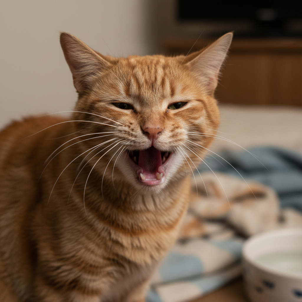 - Nagłe zmiany w głosie – ochrypłe, ciche lub nieobecne miauczenie.