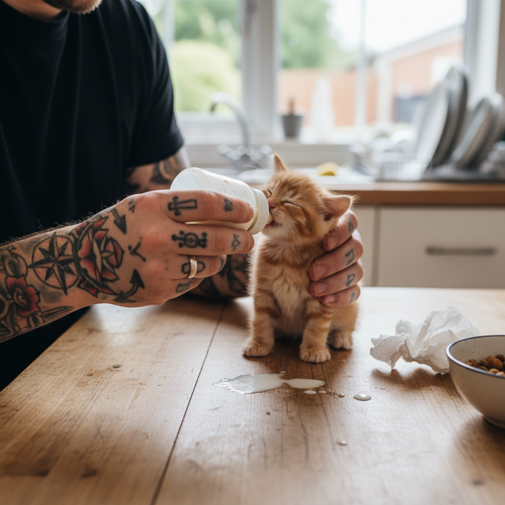 Jedno zdjęcie mówi więcej niż sto słów: butelkowanie kociąt to walka z czasem i emocjami. Alt: Opiekun karmi kocię butelką, kuchnia, emocje, karmienie kociąt.