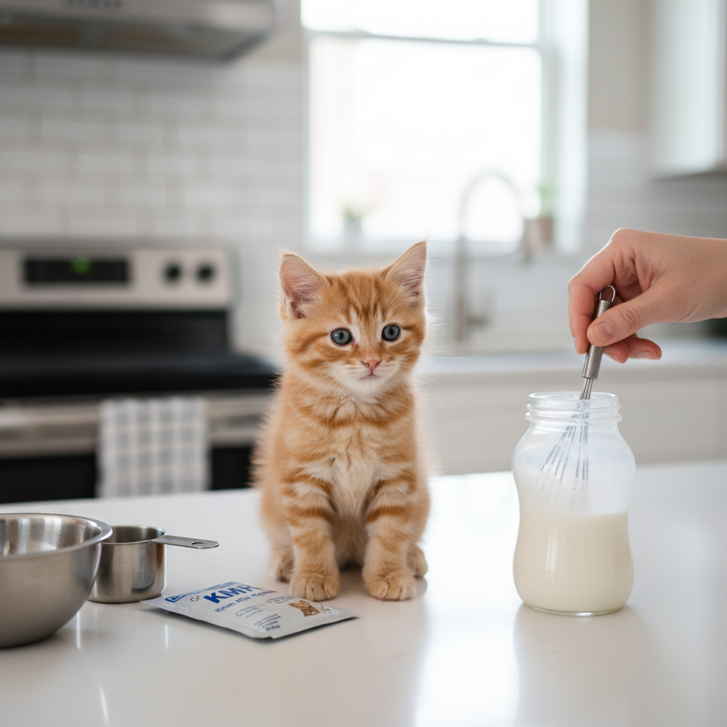 Przygotowanie mleka dla kociąt wymaga precyzji. Alt: Opiekun przygotowuje mieszankę mleczną dla kociąt na kuchennym stole.