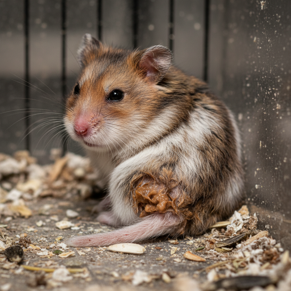- Błyskawiczna biegunka („mokry ogon”) – bardzo groźny objaw, zwłaszcza u młodych chomików.